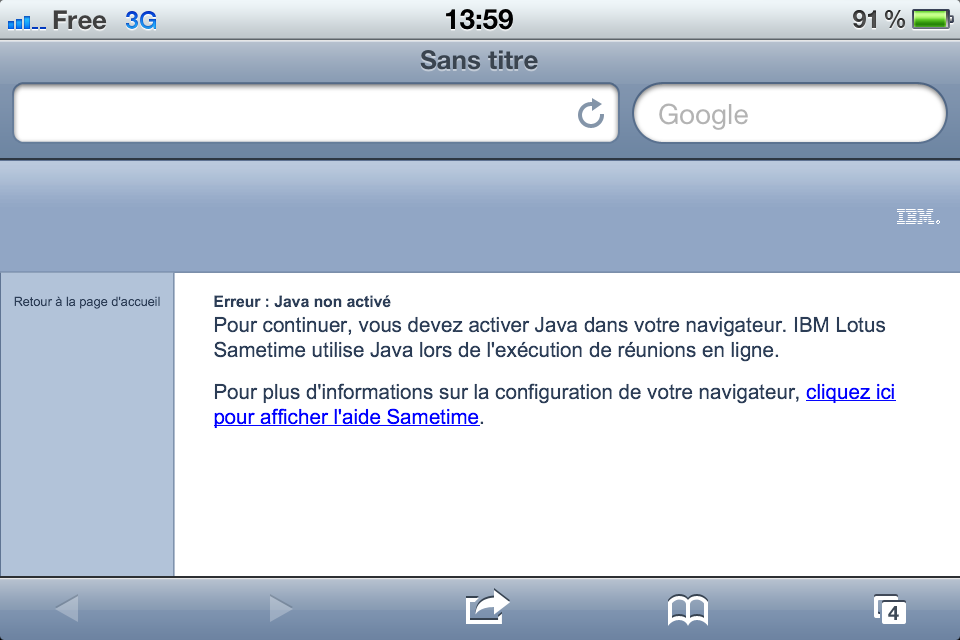 Je sais qu'il est fait mention de Sametime sur la page, mais c'est parce que le serveur webmail est le même que le serveur Sametime, ça marche très bien avec un navigateur classique sur un PC.
