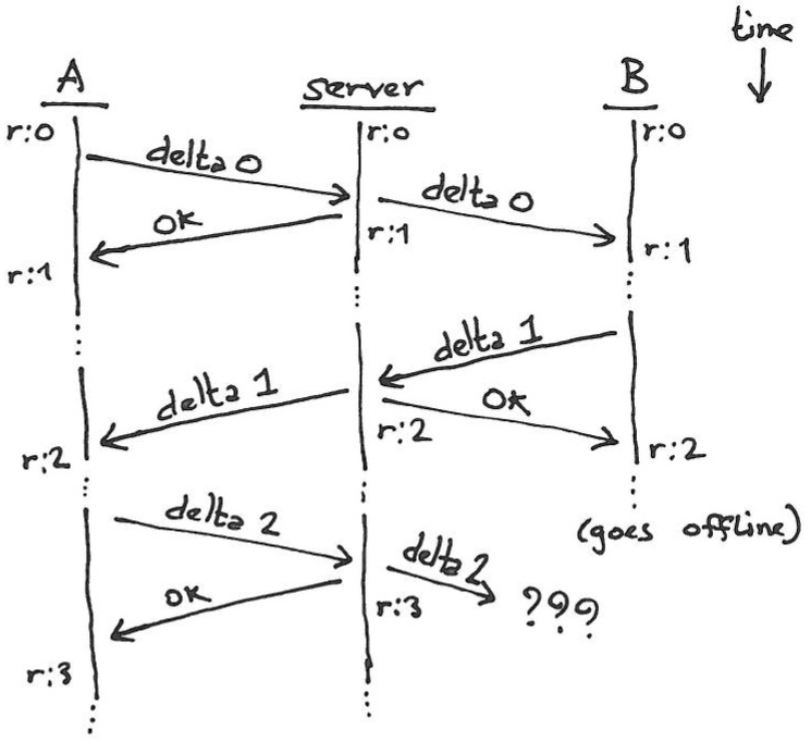 Now suppose the last message ("server to B: delta 2") is lost, because device B has gone offline. At this point device B has a datastore snapshot with revision 2, while A and the server are at revision 3.