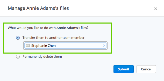 You can use account transfer when you delete a team member's account from Dropbox for Business or later on if it makes more sense (for example, after you've onboarded a new person who will need the files). Keep in mind that you can use account transfer just once for each member.