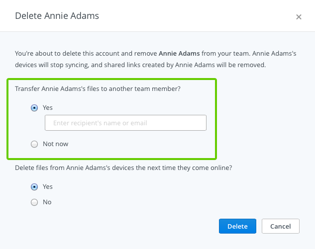 The first option will allow you to transfer the contents of that team member’s account to another member of your Dropbox for Business team. If you don’t want to transfer files at this point, feel free to use the Not now option, and you can transfer them at a later time.