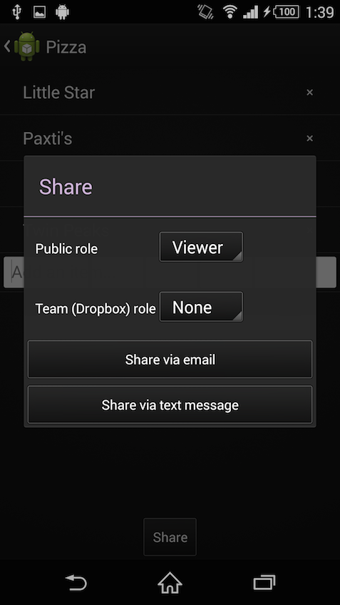 Each list can be shared publicly (or just with your Dropbox for Business team) via a link. When another user opens the link, the shared list will automatically open in their web browser or in one of the mobile apps if they have one installed.