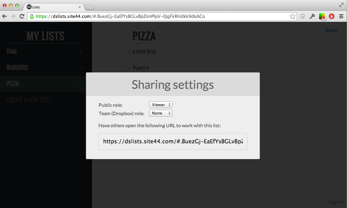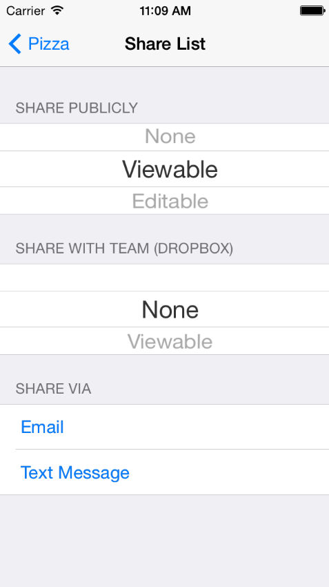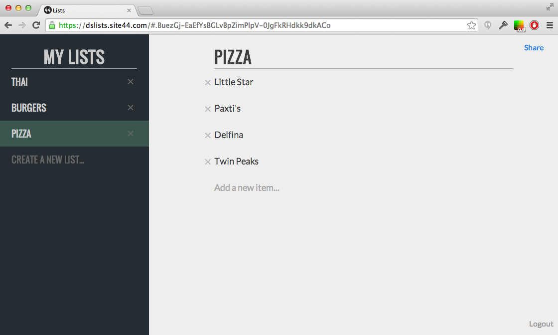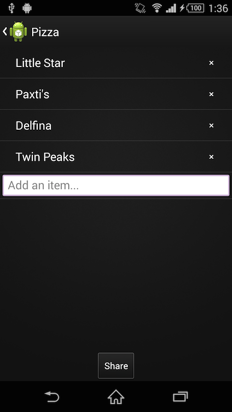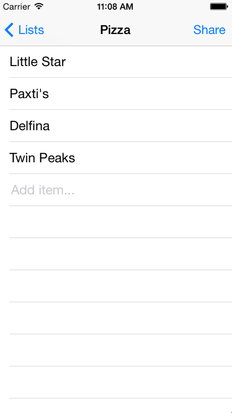 Lists is an iOS, Android, and JavaScript web app that lets you create lists of items and share them with others. For example, you could create a shopping list, a project to-do list, or a list of your favorite pizza joints in San Francisco. Each list is a datastore, and you can make multiple lists.
