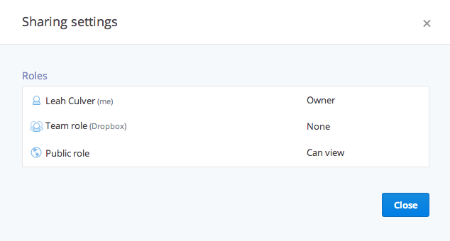 If the datastore is shareable, you can click on the "View sharing settings" link to view the current datastore permissions: the owner, the public role, and team role (if the linked account is a Dropbox for Business user).
