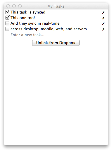 As with our other SDKs, we’ve included example apps for both files and datastores that sync nicely across platforms. For example, now you can watch the Datastore APIs simple task list sync between your Mac app, a JavaScript app in the browser, mobile apps on iOS and Android, and server apps in Python!