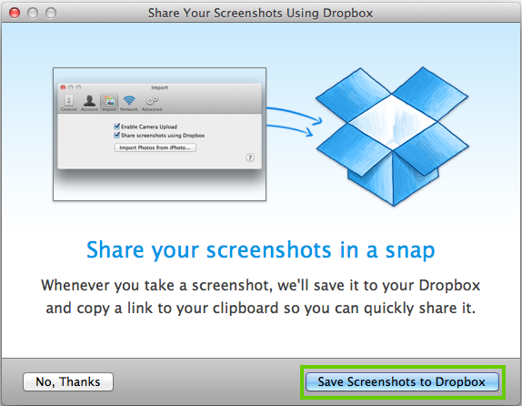 The first time you do this, the application will ask if you want to save screenshots to your Dropbox. Click Save Screenshots to Dropbox.