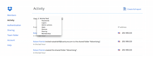 The Activity page shows a summary of the team’s most recent activity. It does not show all actions taken by your team. You can generate a full activity report from a specific period by clicking on Create full report on the Activity tab. You can also view the recent sharing activity for a specific team member by clicking Members in the sidebar on the left, then clicking on the member’s name in the list.