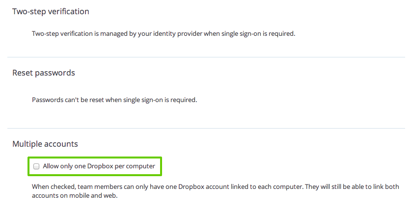 If you don’t want your team members to access both a personal Dropbox and a work Dropbox on the desktop application, you can decide to allow only a single account on each computer.