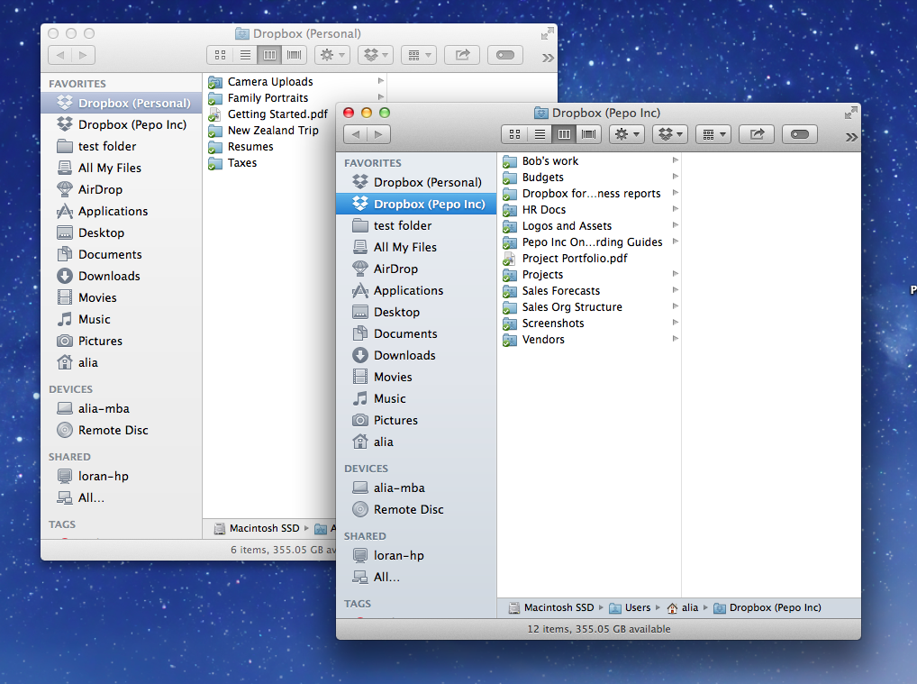 On a computer, the personal Dropbox and work Dropbox are two separate folders. By connecting your Dropboxes, you can use these folders like you would any other folder on the computer. Your work Dropbox displays your company's name so that you can easily tell the folders apart.