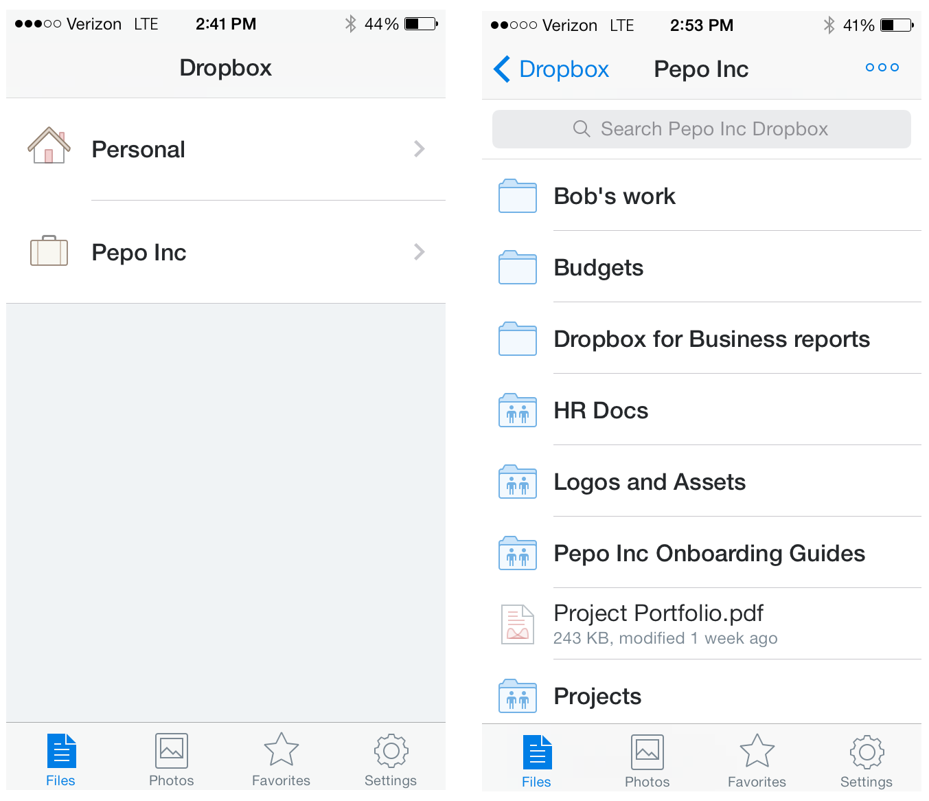 On your mobile device and the Dropbox website, you can quickly switch back and forth between views of your personal Dropbox and work Dropbox without having to sign out and sign in each time.