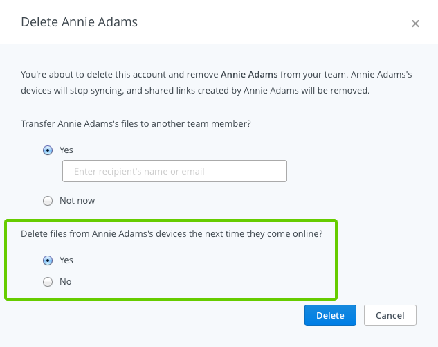 - In the pop-up window, choose to use account transfer now or later, and then select Yes for the option to delete files from that person’s devices the next time they come online.