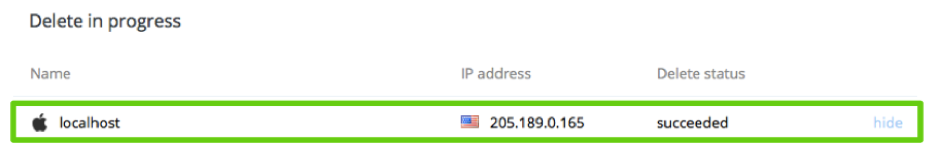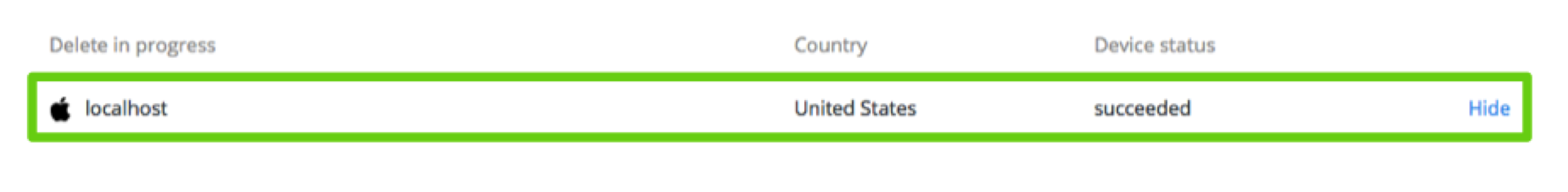 Use the Hide option to remove a device from the list if you no longer need to track it. Using this option will not cancel the remote wipe. If the status of the remote wipe changes, the device will reappear in the list.