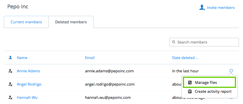 - Click the gear icon to the right of the member's name and select Manage files from the menu.
